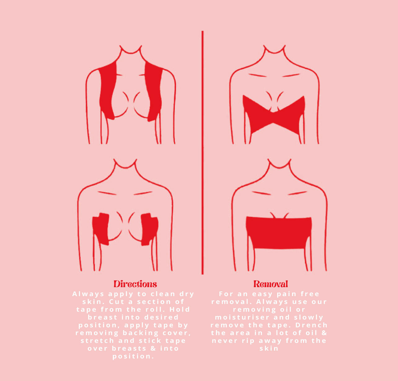 Always apply to clean dry skin. Cut a section of tape from the roll. Hold breast into desired position, apply tape by removing backing cover, stretch and stick tape over breasts & into position.